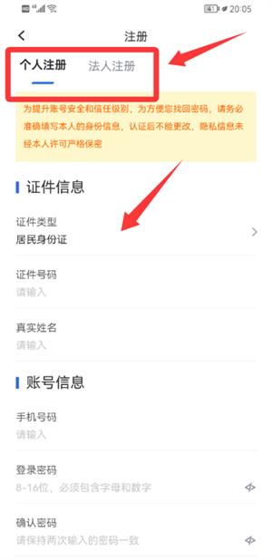 1、進(jìn)入注冊(cè)頁(yè)面選擇個(gè)人或法人類型,填寫(xiě)證件與賬戶信息完成注冊(cè)。