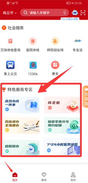 2、登錄后在首頁(yè)特色服務(wù)區(qū),可選擇高效辦事或商企服務(wù)等板塊。
