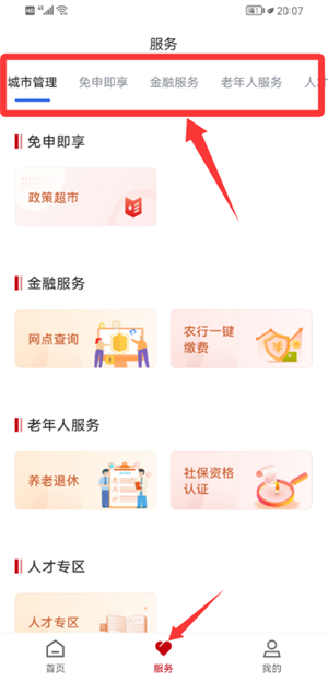 3、進(jìn)入服務(wù)欄目瀏覽城市管理、金融等分類,找到所需服務(wù)項(xiàng)目使用。