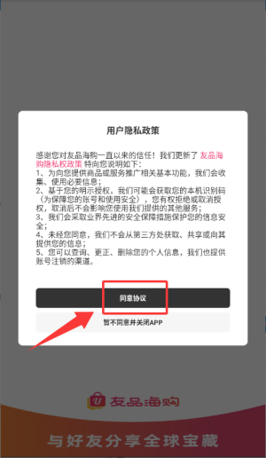 1、啟動(dòng)友品海購應(yīng)用,確認(rèn)用戶隱私政策后繼續(xù)操作。