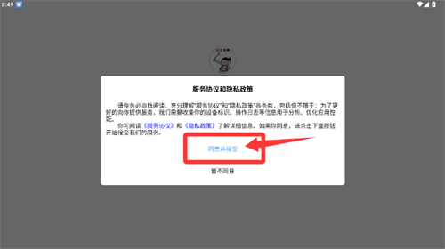 1、打開(kāi)應(yīng)用后,請(qǐng)閱讀服務(wù)協(xié)議與隱私政策,點(diǎn)擊同意并接受。