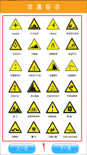 3、點(diǎn)擊下一頁查看警告標(biāo)志,學(xué)習(xí)交通標(biāo)志含義。