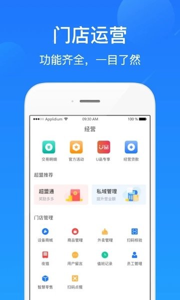 超盟u品商家版是一款為商家提供便利的管理服務(wù)類軟件。軟件界面十分簡潔,能夠為用戶帶來出色而便捷的體驗,全面地經(jīng)營報表分析,齊全的門店運營功能,一目了然,商家能夠隨時隨地在手機上對員工和商品進行便捷的管理,通過各種活動對店鋪進行推廣,增加收益,快來下載使用吧!
