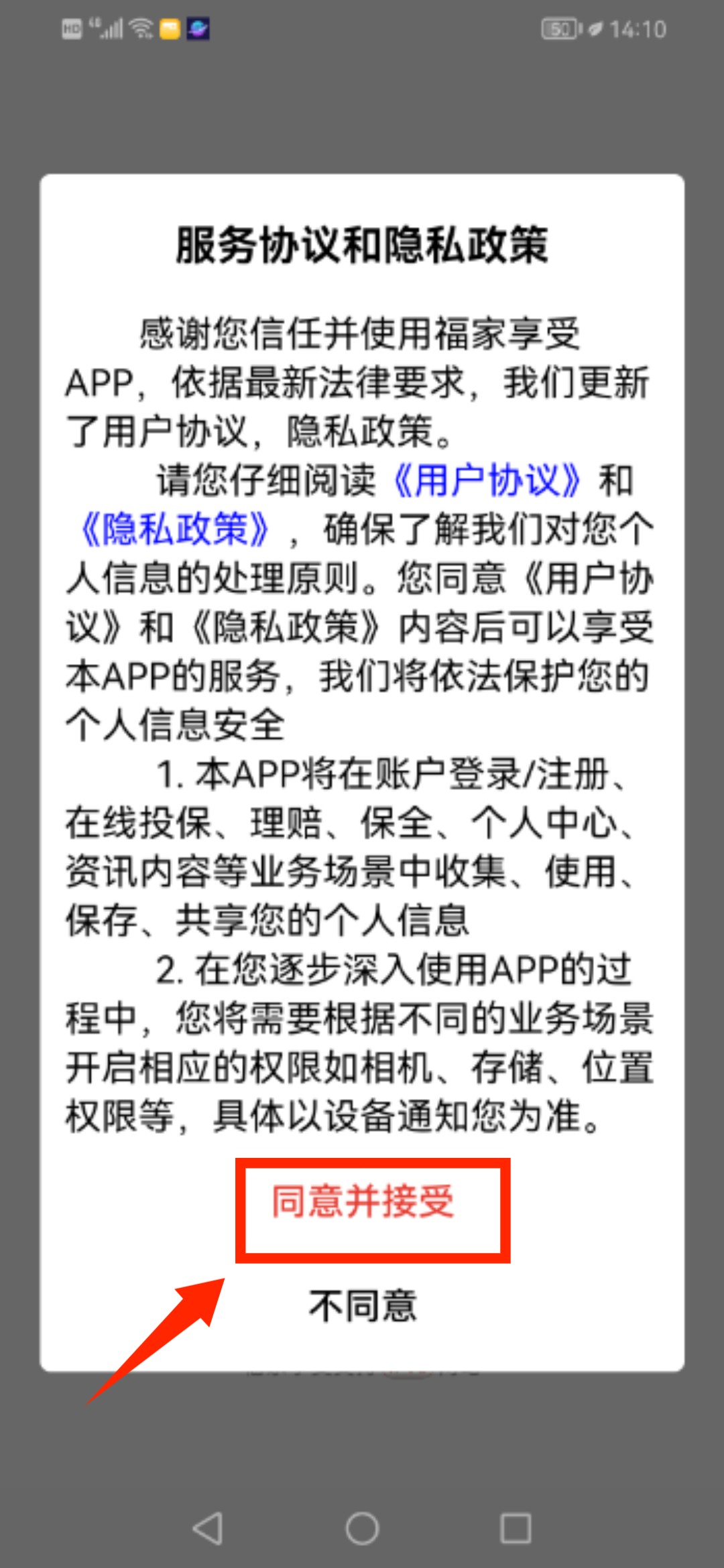1、啟動福家享受應(yīng)用,確認(rèn)服務(wù)協(xié)議與隱私政策后進入。