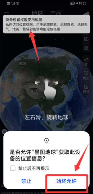 1、當星圖地球請求定位權限時,請選擇始終允許以保障各項功能運行。