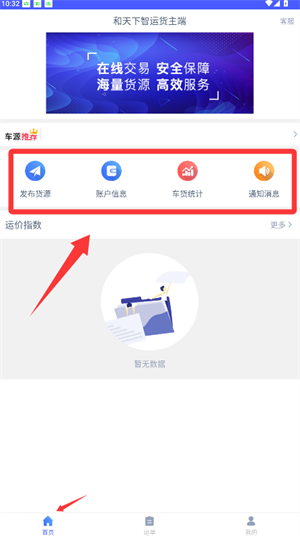 3、最后在主頁,使用發(fā)布貨源與車貨統(tǒng)計(jì)等功能處理業(yè)務(wù)。