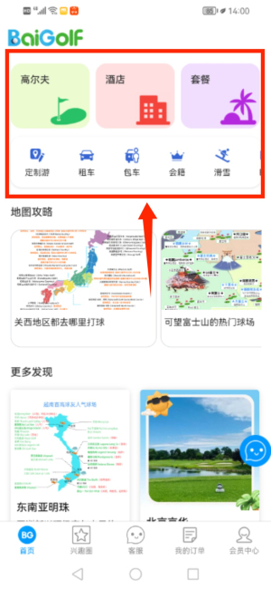 3、進(jìn)入首頁(yè)可選擇高爾夫、酒店等分類及相關(guān)服務(wù)項(xiàng)目。